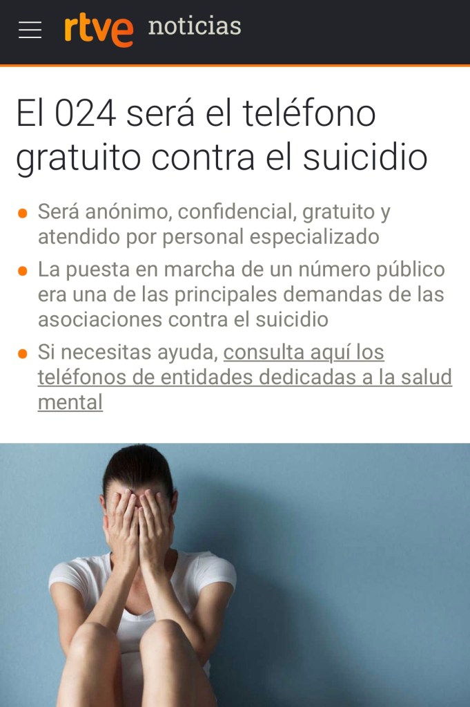 Será el 024. Desde su puesta en marcha puede salvar muchas de las 11 vidas que el suicidio se lleva cada día en España. a continuación os dejo la primera de las intervenciones en pleno en la que traté el asunto. Antes lo habíamos hecho en Comisión.
